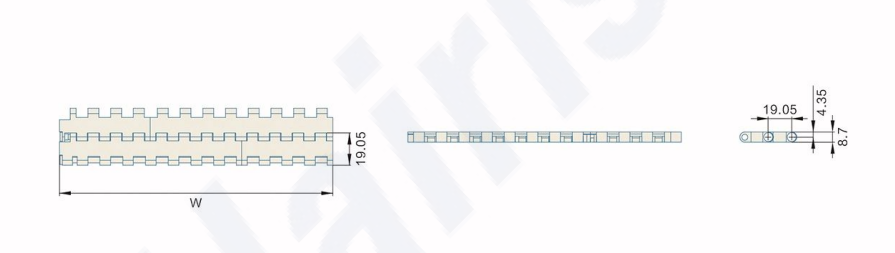 Поверхность: Flat Top (Гладкая); Степень открытости: 0 %; Материал/цвет: Полиацетал (POM),полипропилен (PP)— коричневый,белый; Стандартная ширина модуля: 76, 152 мм; Стандартная ширина ленты: 76*N; Нестандартная ширина ленты: По запросу; Параметры ленты: