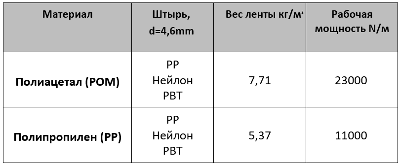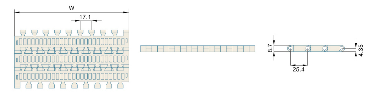 Поверхность: Flat Top (Гладкая); Материал/цвет: Полиацетал (РОМ)— коричневый; Ширина модуля: 170 мм, 100 мм ; Стандартная ширина ленты: 170+85*N Ширина ленты: по запросу; Параметры ленты:
