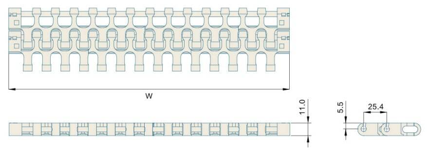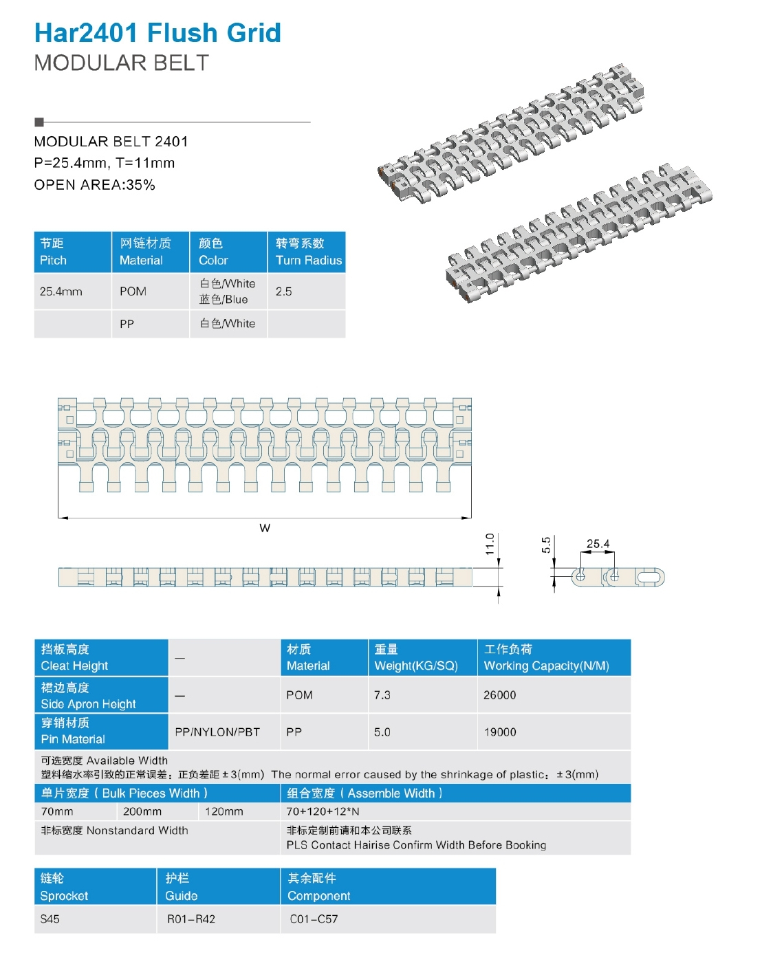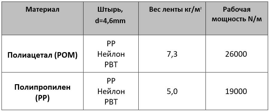 Поверхность: Flush Grid (Открытая); Степень открытости: 35%; Материал/цвет: Полиацетал (РOM)—белый/синий Стандартная ширина модуля: 70 мм, 200мм, 120мм; Стандартная ширина ленты: 70+120+12*N; Нестандартная ширина ленты: По запросу; Параметры ленты: