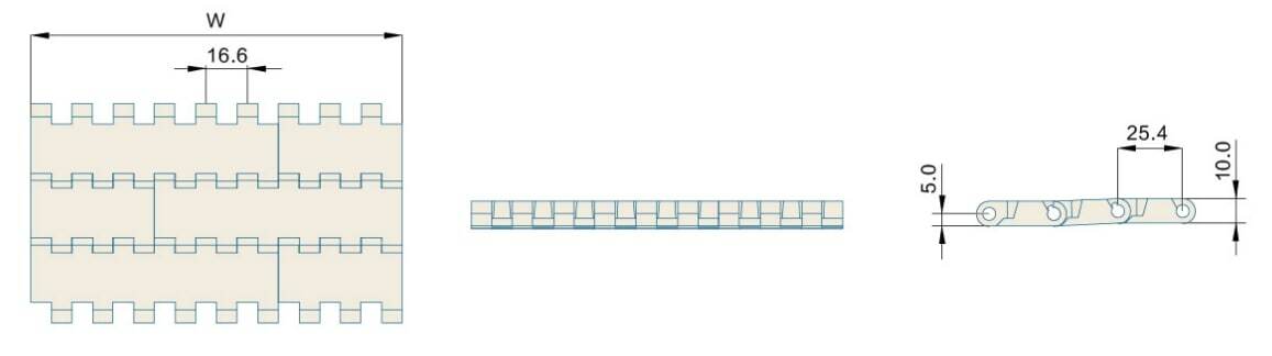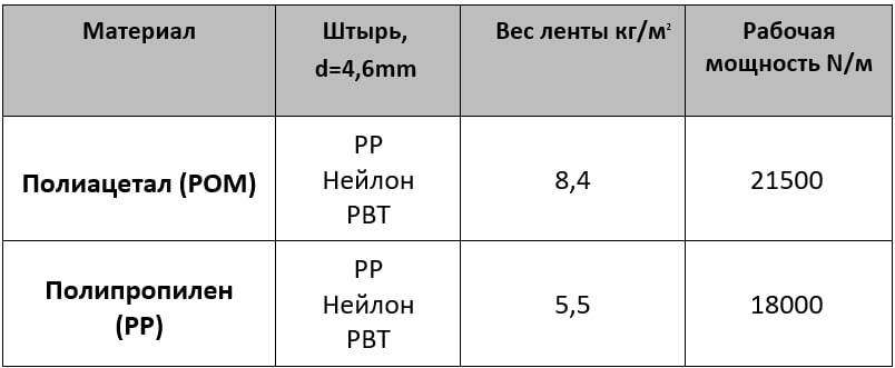 Поверхность: Flat Top (Гладкая); Степень открытости: 0%; Материал/цвет: Полиацетал (РОМ)-белый, синий, коричневый; Полипропилен (РР)-белый, синий, коричневый; Ширина модуля: 50 мм, 100 мм; Стандартная ширина ленты: 100+50*N; Ширина ленты: по запросу; Параметры ленты: