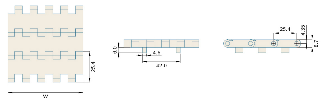 Поверхность: Flat Top (Гладкая); Материал/цвет: Полиацетал (РОМ)— коричневый; Ширина модуля: 85 мм, 170 мм; Стандартная ширина ленты: 85*N Ширина ленты: по запросу; Параметры ленты: