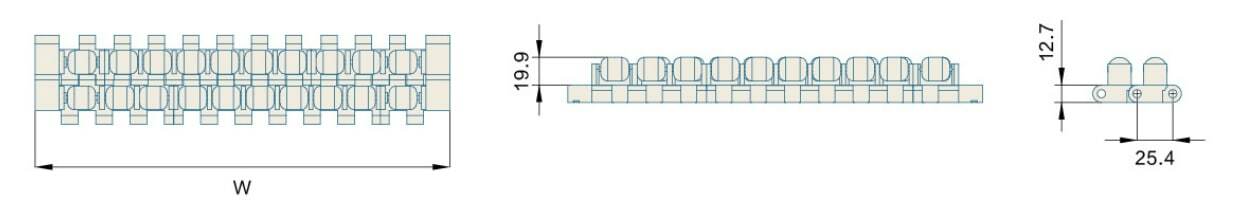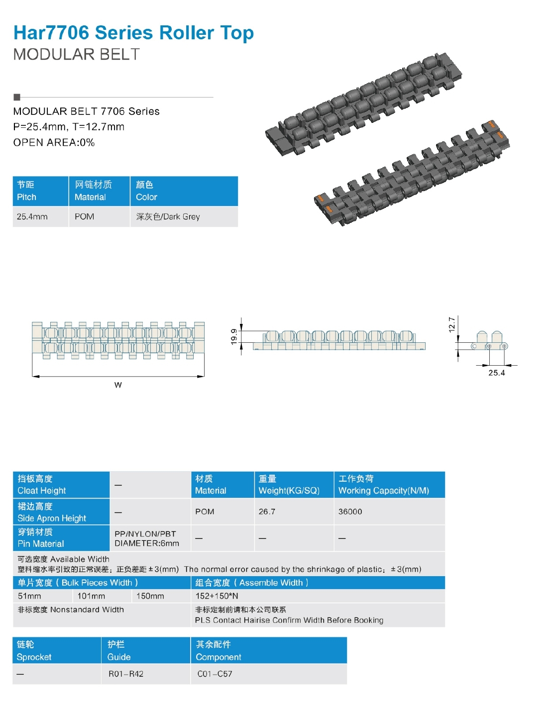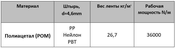 Поверхность: Roller Top (Роликовый верх); Степень открытости: 0%; Материал/цвет: Полиацетал (РОМ)-темно-серый; Ширина модуля: 51 мм, 101 мм, 150 мм; Стандартная ширина ленты: 152+150*N Ширина ленты: по запросу; Параметры ленты: