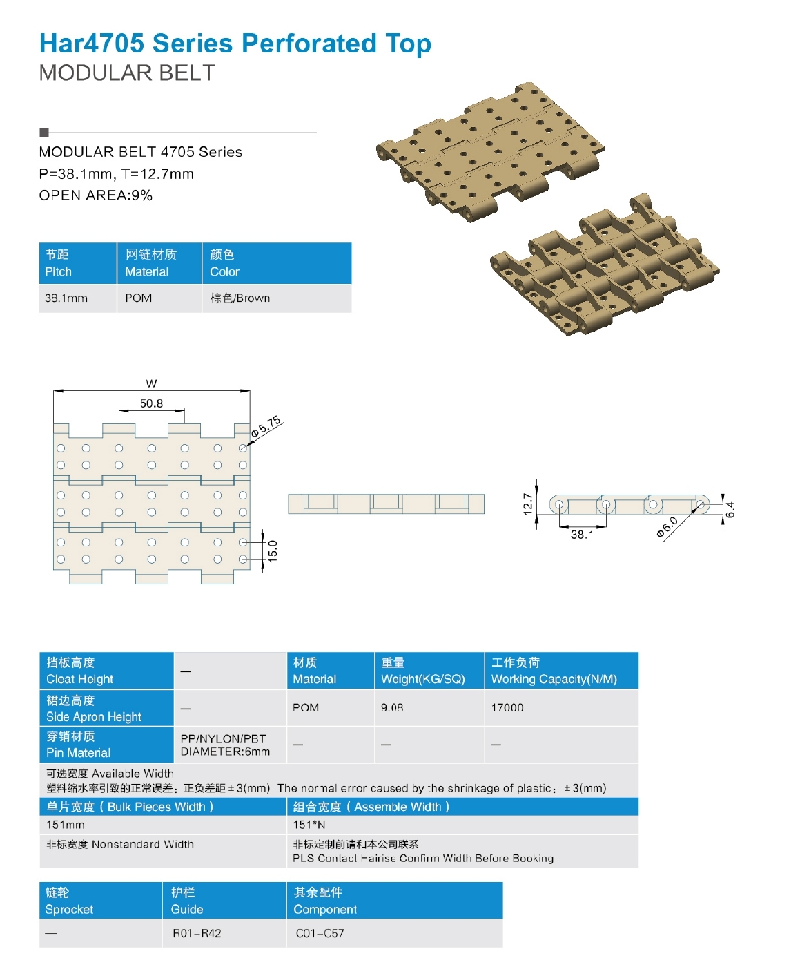 Поверхность: Perforated flat top (Гладкая с перфорацией); Степень открытости: 9% Материал/цвет: Полиацетал (POM)— коричневый; Ширина модуля: 151 mm; Стандартная ширина ленты: 151*N; Ширина ленты: по запросу; Параметры ленты: