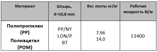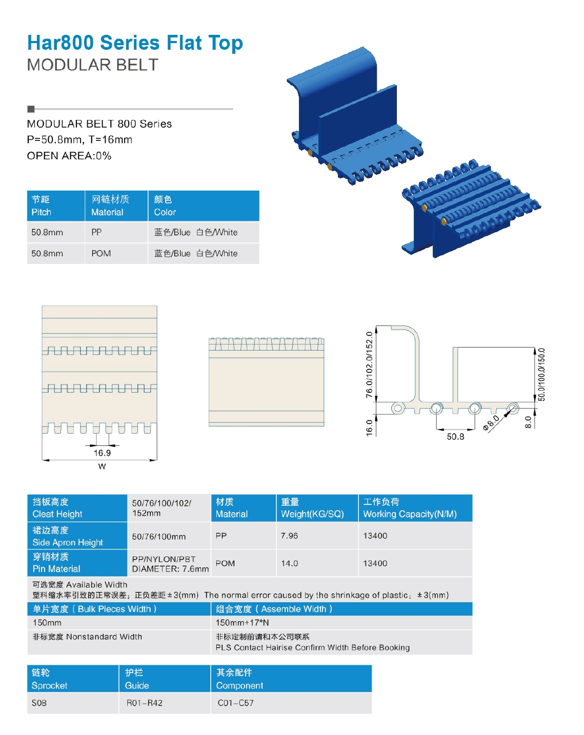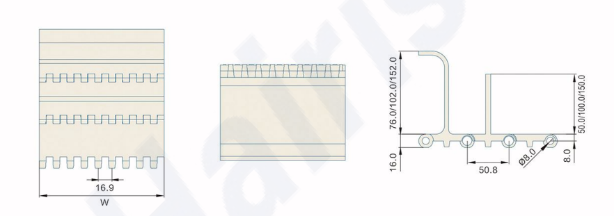 Поверхность: Flat Top (Гладкая); Степень открытости: 0% Материал/цвет: Полиацетал (POM), полипропилен (PP) — синий, белый; Ширина модуля: 150 mm; Стандартная ширина ленты: 150mm+17*N; Ширина ленты: по запросу; Параметры ленты: