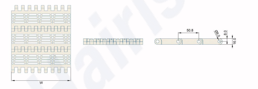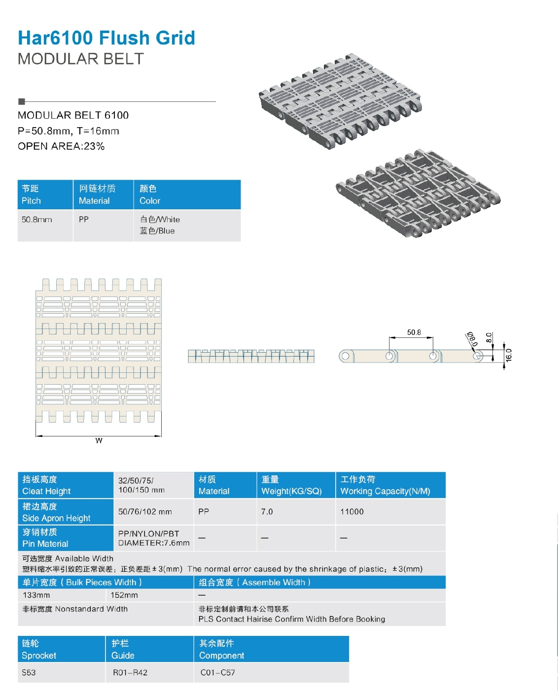 Поверхность: Flush Grid (Открытая); Степень открытости: 23% Материал/цвет: Полипропилен (PP) — синий, белый; Ширина модуля: 133 mm, 152mm; Стандартная ширина ленты: -; Ширина ленты: по запросу; Параметры ленты: