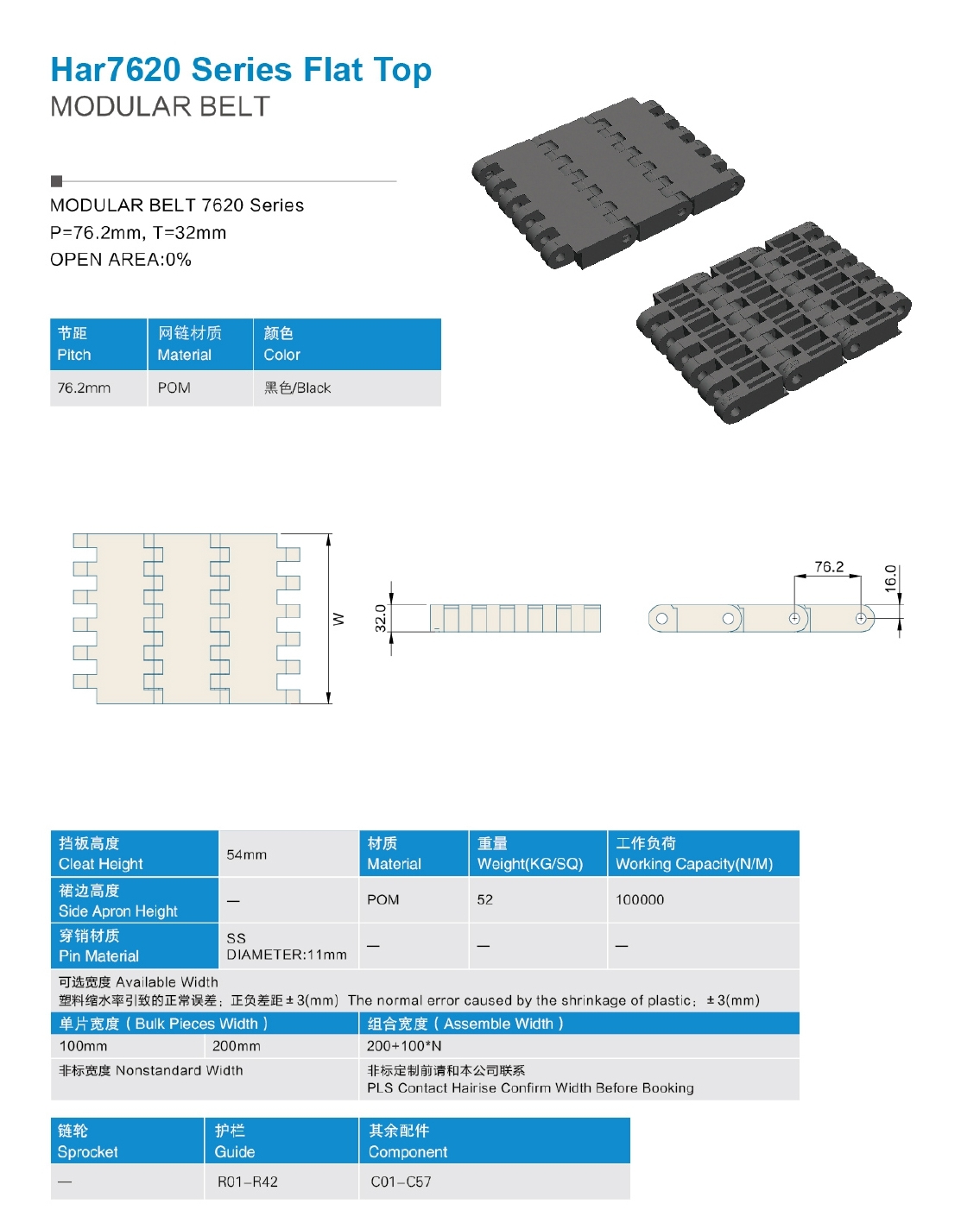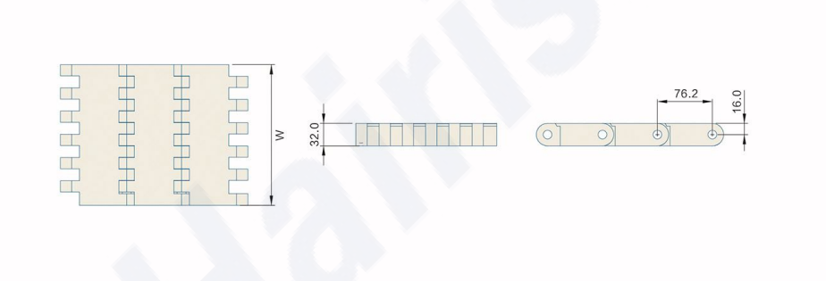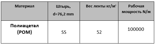 Поверхность: Flat Top (Гладкая); Степень открытости: 0% Материал/цвет: Полиацетал (POM) — черный; Ширина модуля: 100mm, 200mm; Стандартная ширина ленты: 200+100*N; Ширина ленты: по запросу; Параметры ленты: